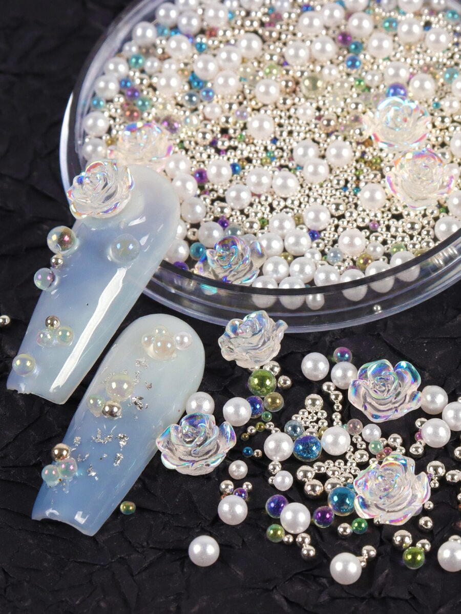 1 caja de decoraciones de arte de uñas 3D transparentes con flores de rosa, perlas, cuentas plateadas, rhinestones, accesorios de arte de uñas de verano, joyería de uñas DIY y suministros para uñas