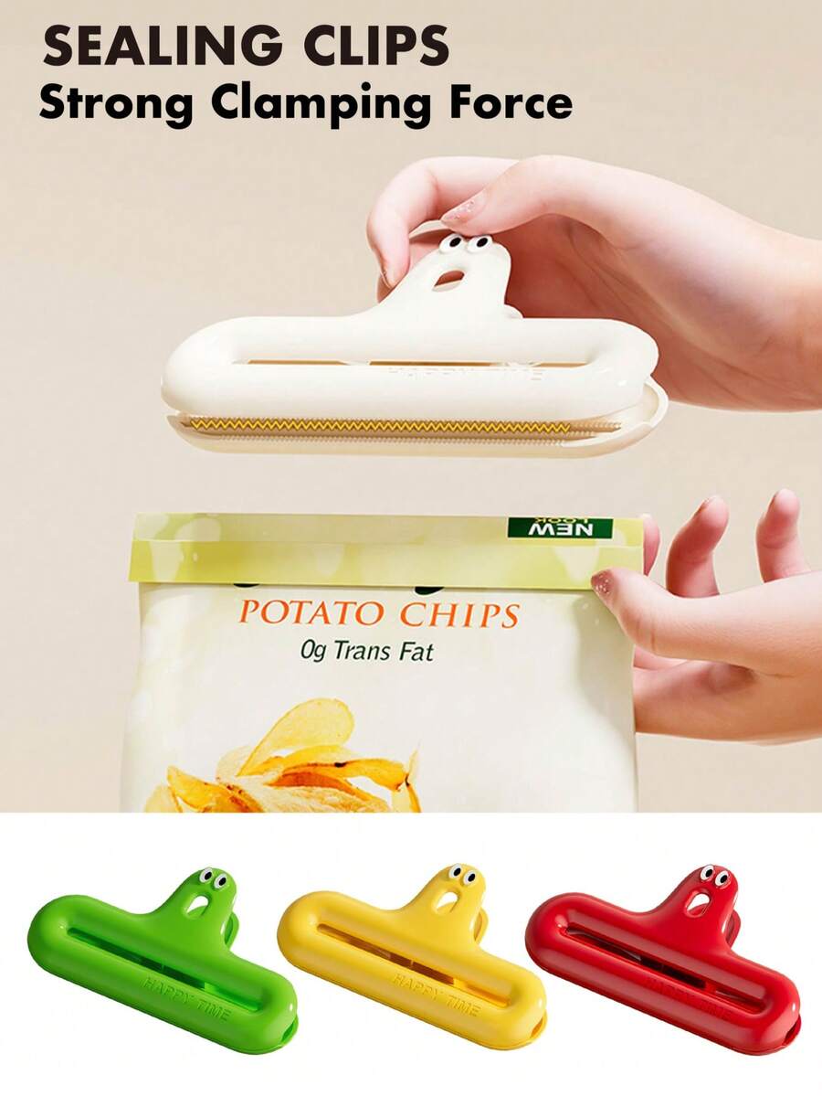 1 pieza Clip sellador de bolsas de comida, sellador de bolsas de aperitivos de dibujos animados lindo, hecho de ABS duradero, abertura grande que se ajusta a diferentes tamaños de bolsas de aperitivos, mandíbula con clip de acero inoxidable dentado, fuerza de sellado fuerte, a prueba de humedad, diseño con orificio colgante para almacenamiento ahorrando espacio, disponible en blanco, rojo, amarillo, verde