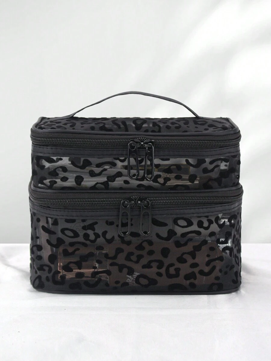 1 pieza Bolsa de maquillaje de malla negra con estampado de leopardo de doble capa, portátil y de gran capacidad, adecuada para almacenar cosméticos y herramientas de maquillaje, ideal para uso doméstico y al aire libre, regalo esencial para mujeres, bolsa de aseo de viaje para maquillaje, bolsa con cremallera para accesorios de manicura, bolsa de cosméticos, neceser, bolsa de cosméticos, bolsa de cosméticos pequeña, regalo de Navidad, bolsa pequeña, bolsa de regalo/bolso pequeño, bolsa de almacenamiento de cosméticos, bolsa de almacenamiento mini, bolsa de almacenamiento de gran capacidad, regalo de Navidad, regalo creativo para mujeres