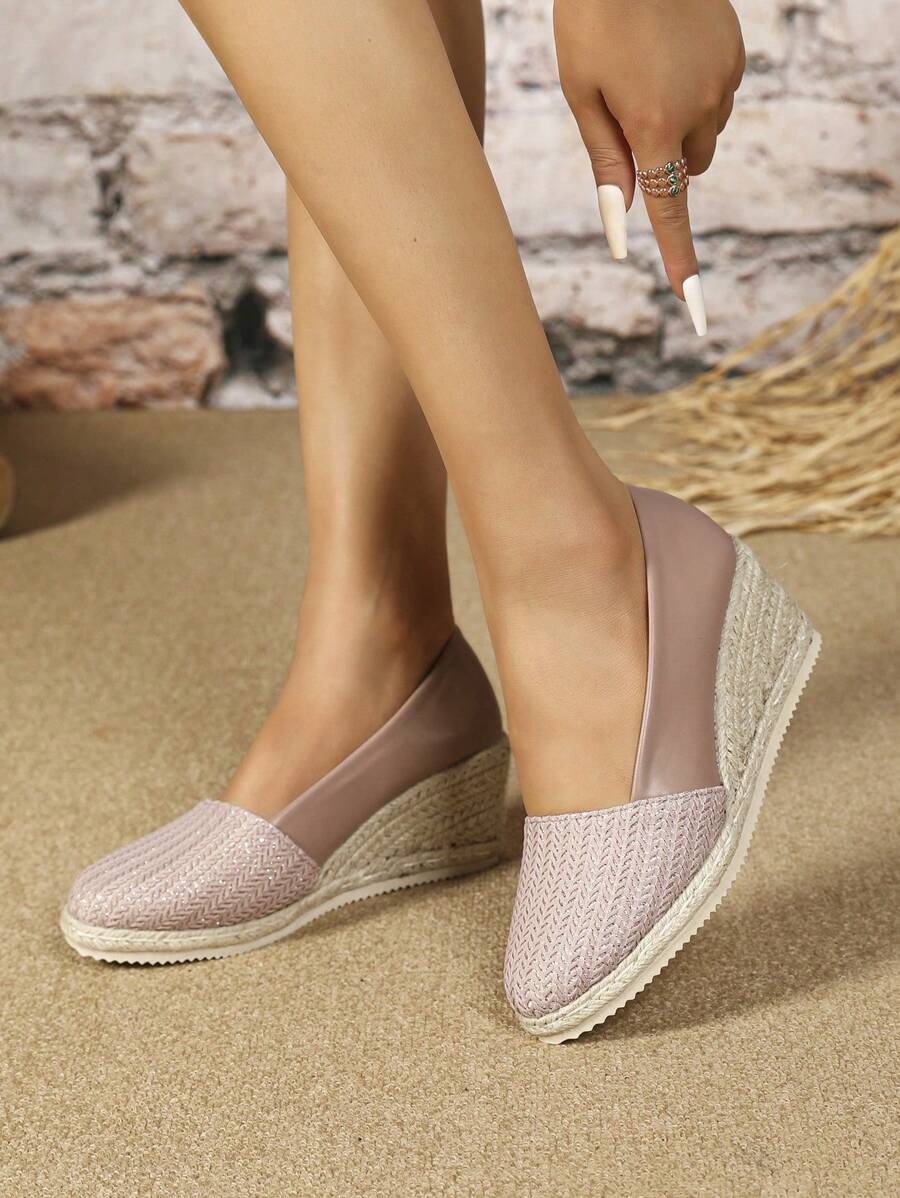 Zapatos de cuña de moda 2025, versátiles de punta redonda, estilo europeo y americano, zapatos de lino de tacón alto para mujer, cómodos y casuales para vacaciones, adecuados para todas las estaciones