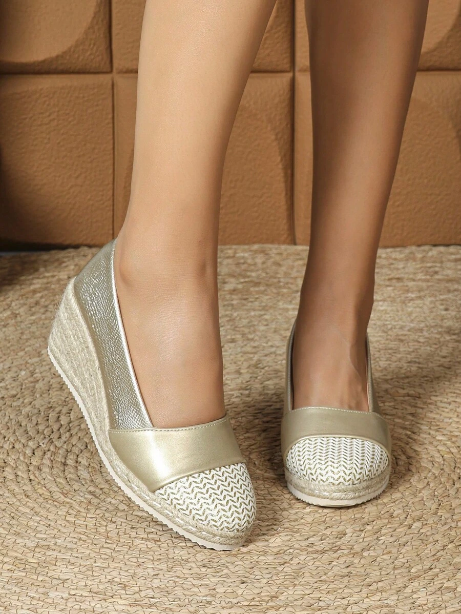 Zapatos de mujer con cuña 2025, nueva temporada, puntera redonda, plataforma con trenza de paja, tacón alto de lino, estilo slip-on, moda casual y cómoda para vacaciones
