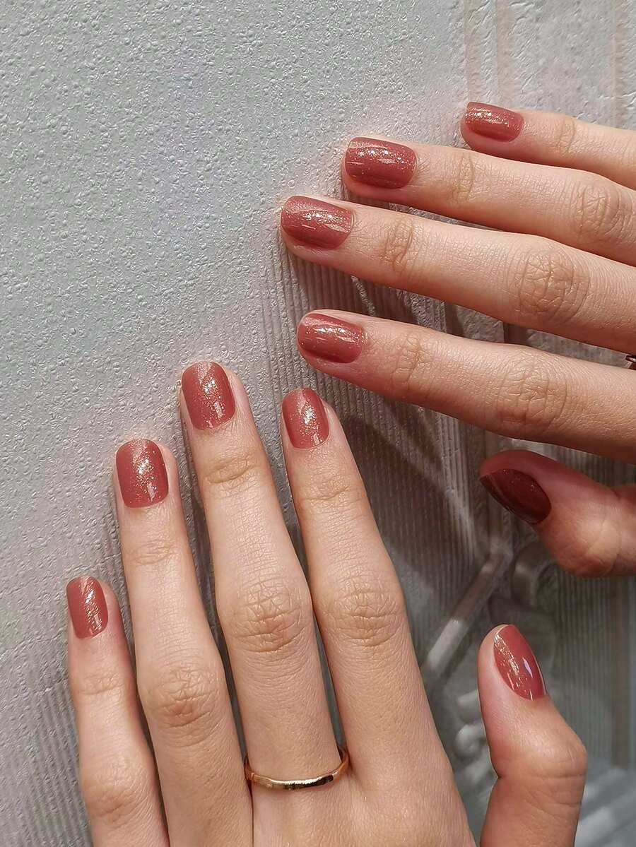 24 uñas postizas cuadradas cortas, uñas cortas de color rosa dorado brillante, manicura de unicolor minimalista, adecuado para chicas/mujeres en citas, regalos, San Valentín, atuendo diario, incluye 1 pieza de gel de gelatina y 1 pieza de lima de uñas