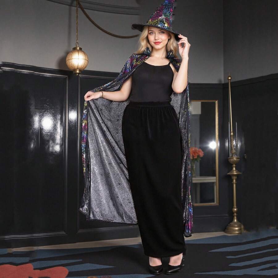Set de 2 piezas de capa negra y sombrero puntiagudo con estampado de telaraña de colores, conjunto de disfraz de bruja para Halloween, con capa interior intercambiable, disfraz para fiesta de magia y cosplay