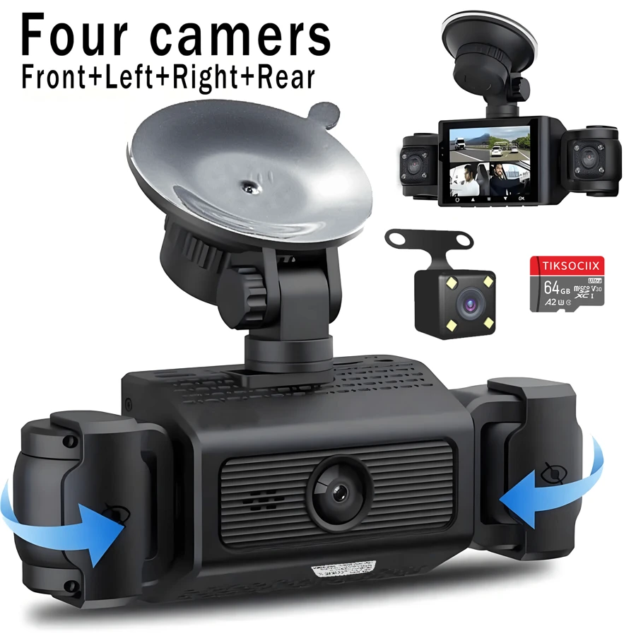 Cámara de salpicadero de 4 canales 1080P con visión nocturna, lente ajustable, grabación en bucle, monitor de estacionamiento de 24 horas, alimentación de enchufe del coche, voltaje de funcionamiento de 5 V, no impermeable, batería recargable, incluye opción de tarjeta de 64 GB