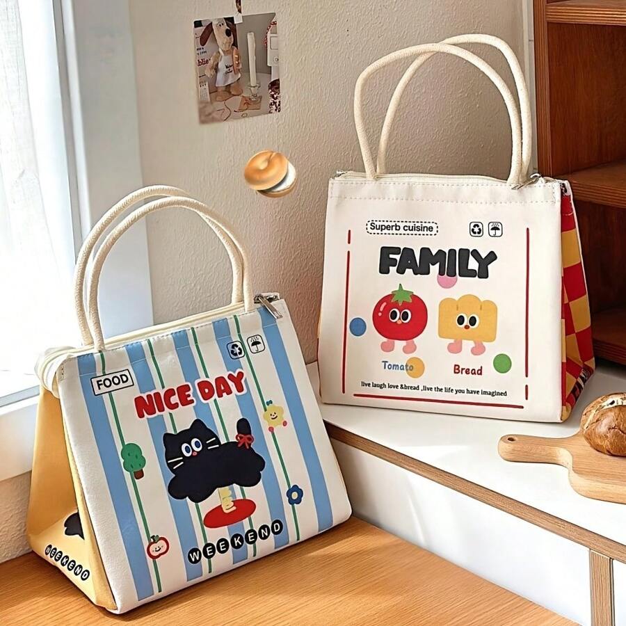 Una linda bolsa térmica de almuerzo con diseño de dibujos animados, de gran capacidad, adecuada para fiestas, picnics, campamentos, caja bento, fácil de lavar, con diseño de impresión de posicionamiento, portátil y conveniente, muy adecuada para estudiantes, trabajadores de oficina y adultos, regalos de regreso a clases, regreso a clases