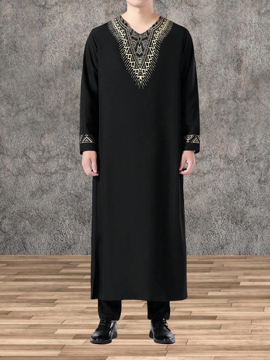 Un vestido musulmán de manga larga con cuello en V y estampado de moda para hombres, camisas Henley a rayas, túnica musulmana larga, Thobe y bata larga para hombres