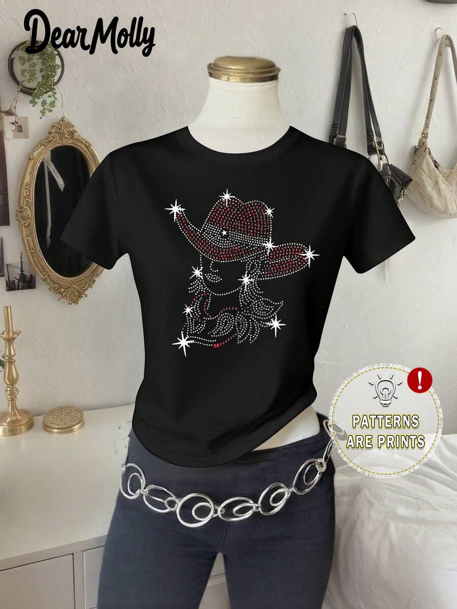 Camiseta gráfica de vaquera estilo occidental para mujer DEAR MOLLY, de cuello redondo y manga corta, con vibra festiva, adecuada para fiestas de primavera/verano, ropa de estilo occidental