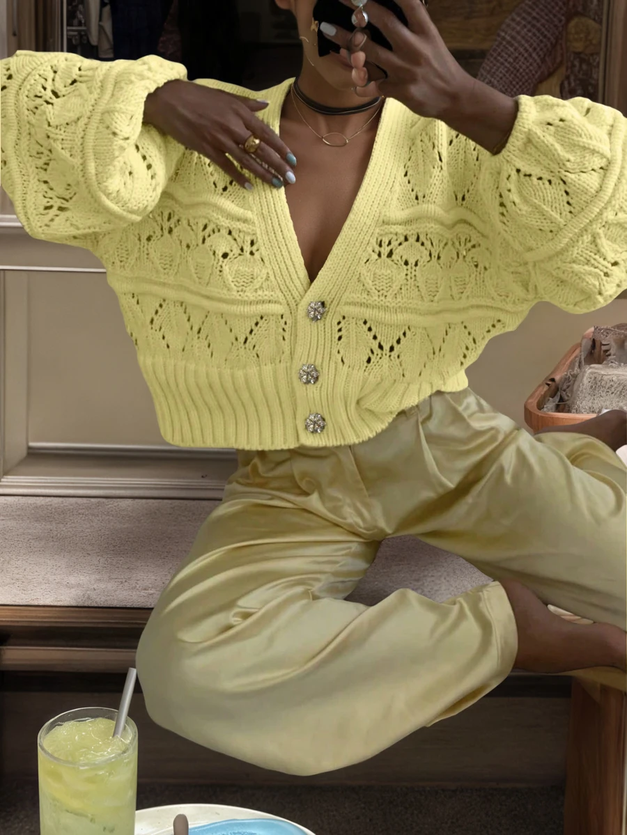 Cárdigan de mujer con cuello en V, manga larga, de tela semitransparente con estiramiento medio, suéter de punto trenzado de longitud regular
