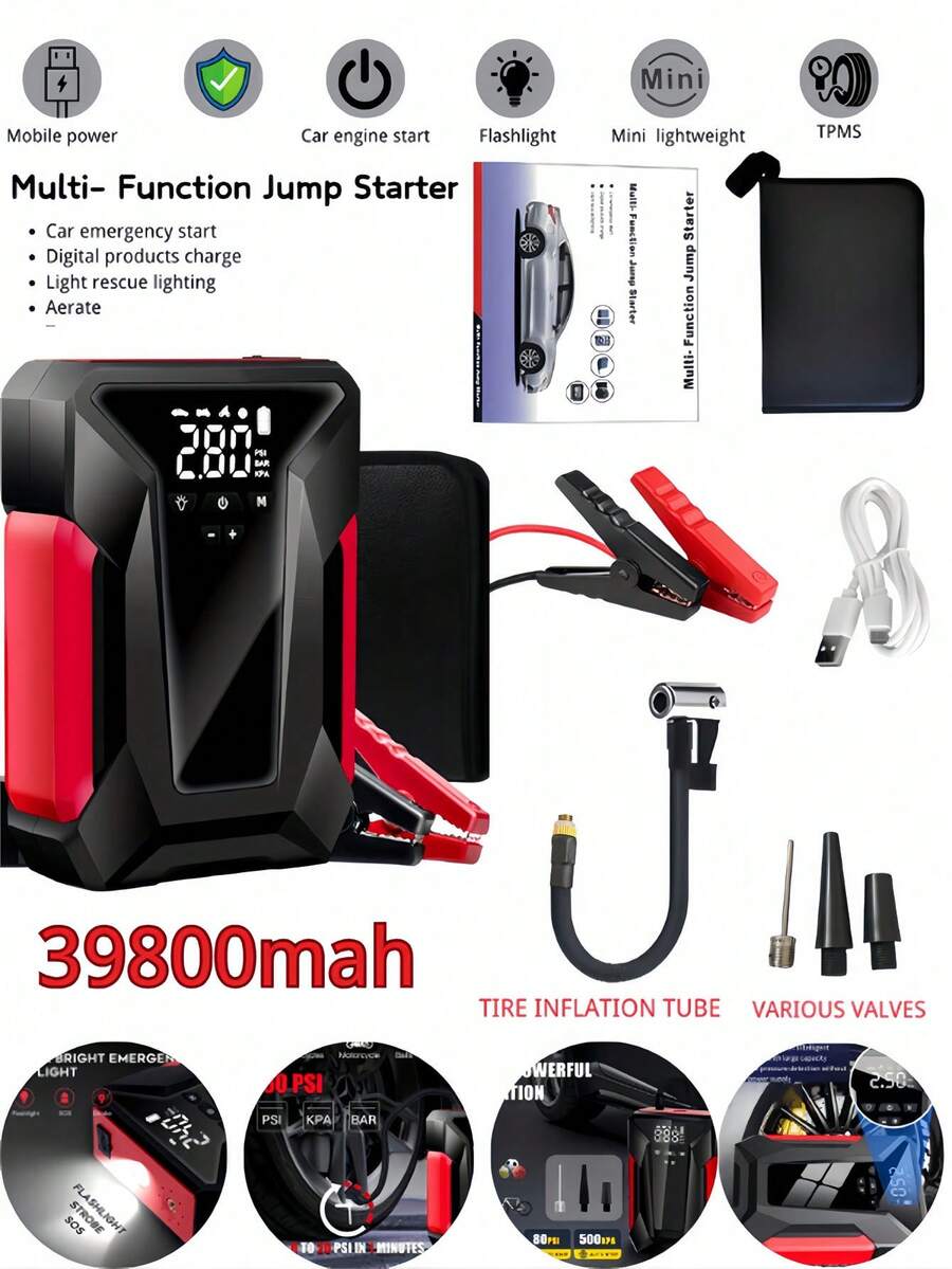 Arrancador portátil de coche con compresor de aire, luz LED de emergencia y batería externa - Carga rápida para teléfonos, portátiles, coches, camiones, autocaravanas y talla grande - Incluye bolsa de almacenamiento, cargador de batería de vehículo | Batería compacta | Características avanzadas, arrancador portátil de batería de coche