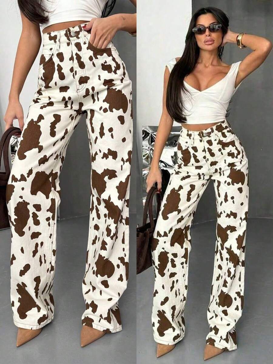 SQUALO Pantalones casuales de cintura alta con estampado de vaca y ajuste holgado para mujer