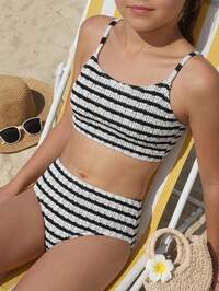SHEIN Conjunto de bikini a rayas de dos piezas para niñas, con diseño a rayas negro lindo, con tirantes ajustables, conjunto de bikini de cintura alta, conjunto de bikini modesto de dos piezas, conjunto de traje de baño de vacaciones de dos piezas, conjunto de traje de baño de dos piezas, traje de baño de verano de dos piezas, ropa de playa, conjunto de traje de baño para niñas a rayas, traje de baño de dos piezas para niña preadolescente, conjunto de playa de dos piezas, traje de baño a rayas blanco y negro #7 Más vendidos