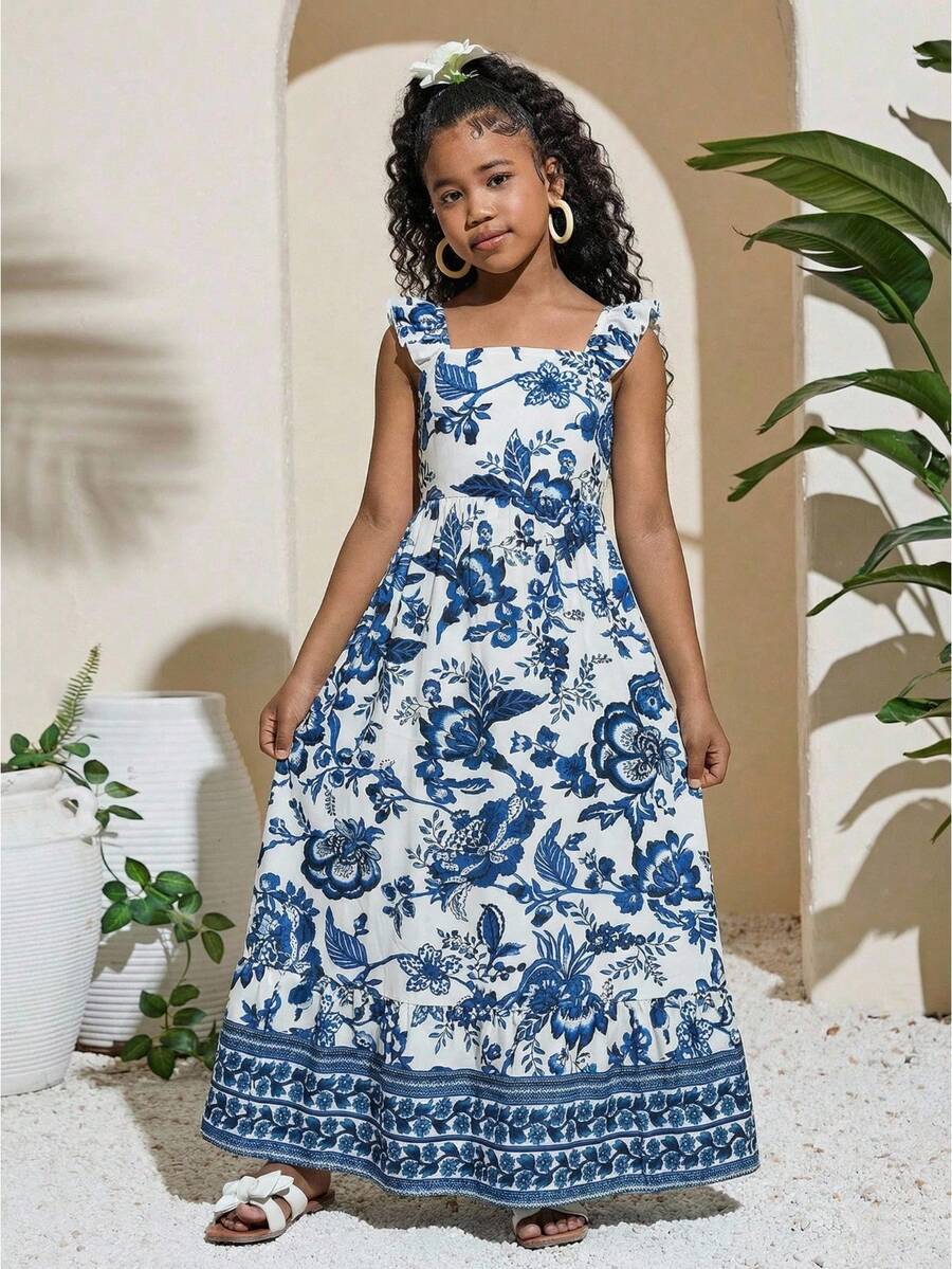Vestido largo de verano con cuello cuadrado, estampado floral retro azul, para niñas preadolescentes - Vestido de verano, vestido floral, cuello cuadrado, conjunto a juego madre e hija