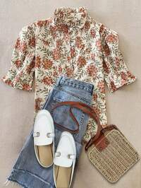 SerisseSerisse Blusa de mujer vintage francesa de seersucker con estampado de cuadros, camisa marrón, camisa caqui, top marrón, para salir, top para salir, blusa elegante de mujer, elegante de mujer, otoño de mujer, invierno de mujer, casual de negocios de mujer, elegante de mujer, blusa con volantes de invierno para mujer #4 Más vendidos