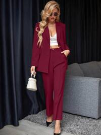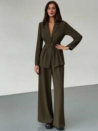 Elenzga Conjunto de traje de mujer, tela de traje, cuello de solapa, manga larga, cintura ceñida con dobladillo asimétrico en línea A, decoración de botón de metal, sofisticado y elegante para la oficina, el transporte, el estilo callejero, el romanticismo francés, casual, vintage de Oriente Medio, el té de la tarde, la fiesta, el Día de Acción de Gracias, el regreso a la escuela, primavera/otoño/invierno