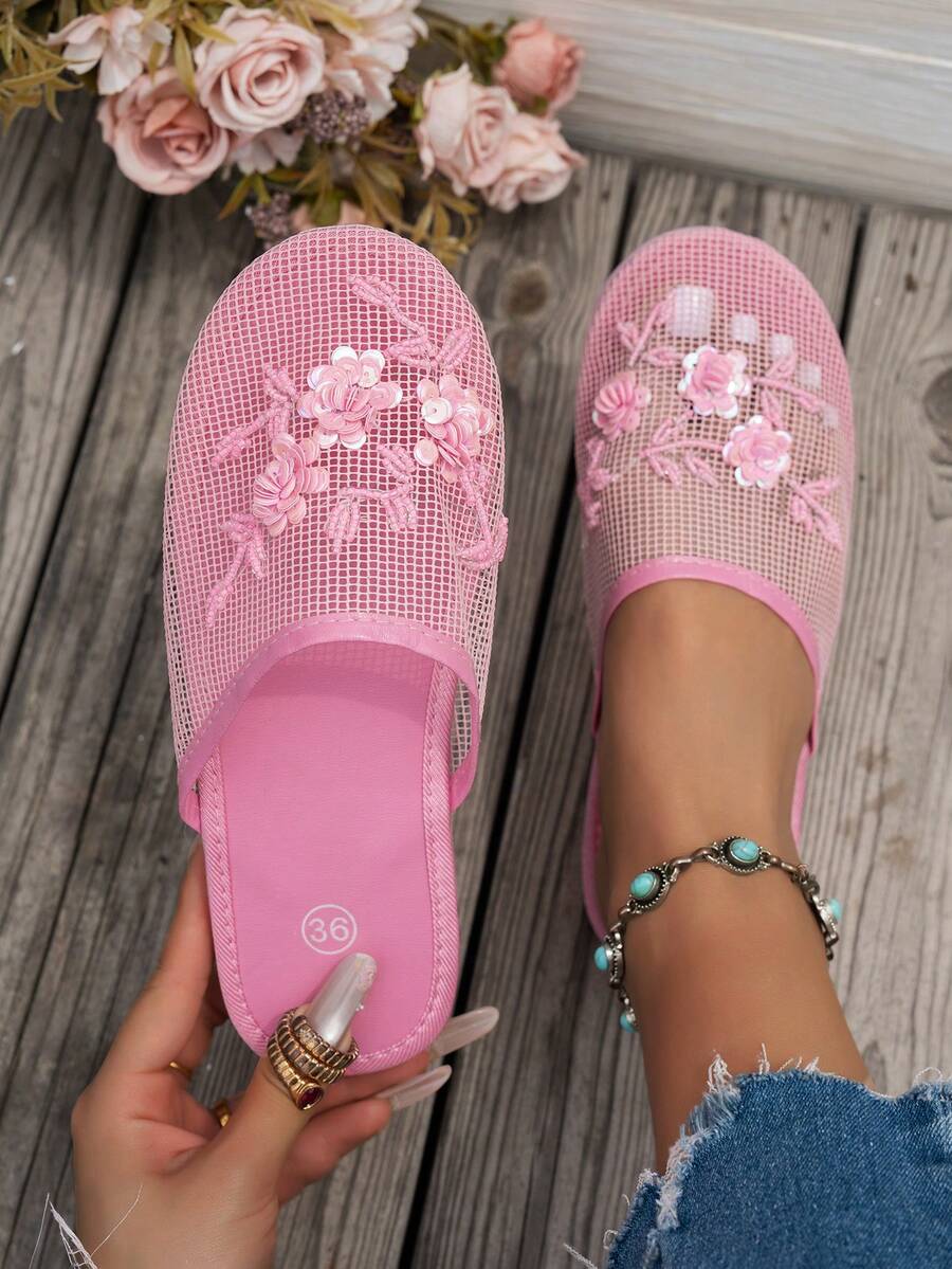 Sandalias planas elegantes con decoración floral de cuentas y lentejuelas hechas a mano en color rosa para mujer, cómodas, ligeras y transpirables, tipo mula estilo Y2K para primavera/verano, con suela de EVA para usar en la playa, vacaciones o en interiores