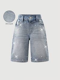 2026 Nuevas Llegadas Shorts Vaqueros para Niñas Jóvenes, Color Denim Azul Medio, Estilo Universitario Y2K, Adornados con Rhinestones y Perlas, Versátil para Viajes, Cómodo Algodón, Apropiado para Uso Diario, Escuela, Transporte, Fiestas, Vuelta al Colegio #8 Más vendidos