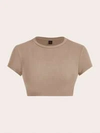 SHEIN ICON Camiseta corta de mujer de cuello redondo, manga corta y ajustada en color caqui, apta para el verano